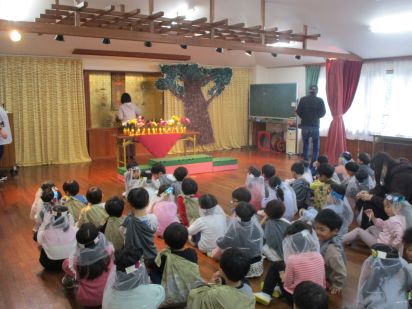 お釈迦様がお悟りを開かれた12月8日に行われる法要を成道会(じょうどうえ)といいます。当日男児は、お悟りを開かれるまでの修行中の「お釈迦様」の姿に、女児は修行中に倒れたお釈迦様にミルクを差し上げて命を救った心やさしい娘「スジャータ」に模した姿になります。集いでは、年齢単位でお参りや紙芝居等で過ごします。